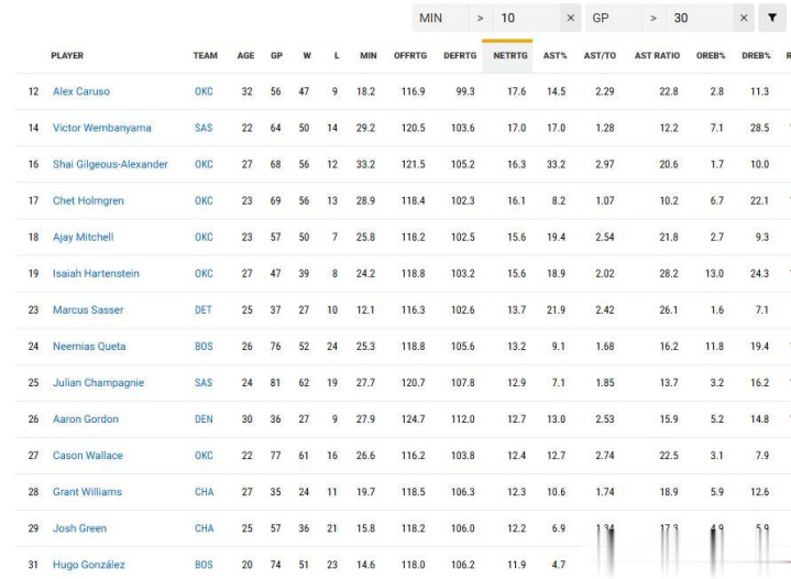 这里也说明下,这是NBA官网数据查询,且按最少出场30场最低10分钟计算,卡鲁索绝对的第一,净效率也是第一。
