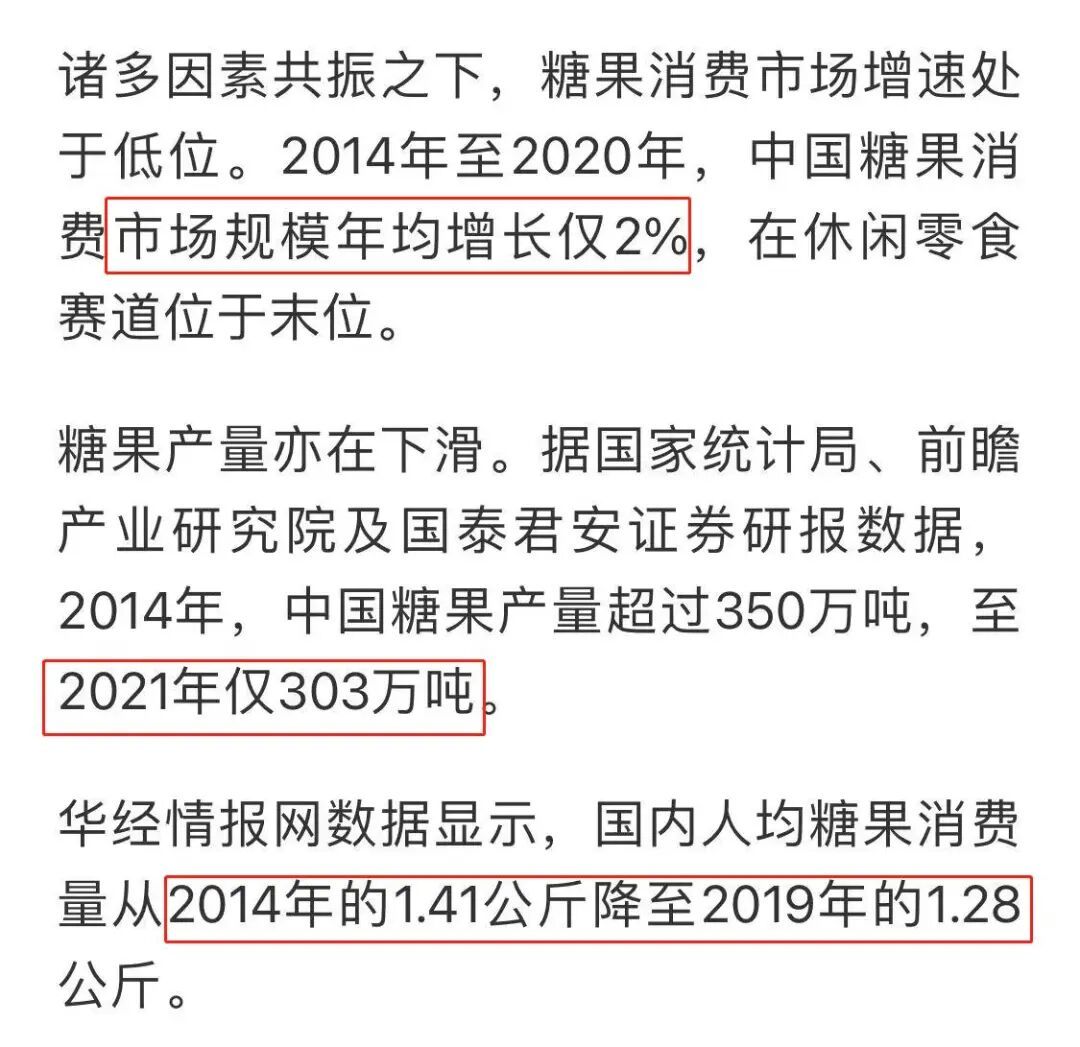 而且数据显示从2014年到2020年,国内糖果市场总规模年均增长率只有可怜的2%,在休闲零食赛道里几乎垫底。